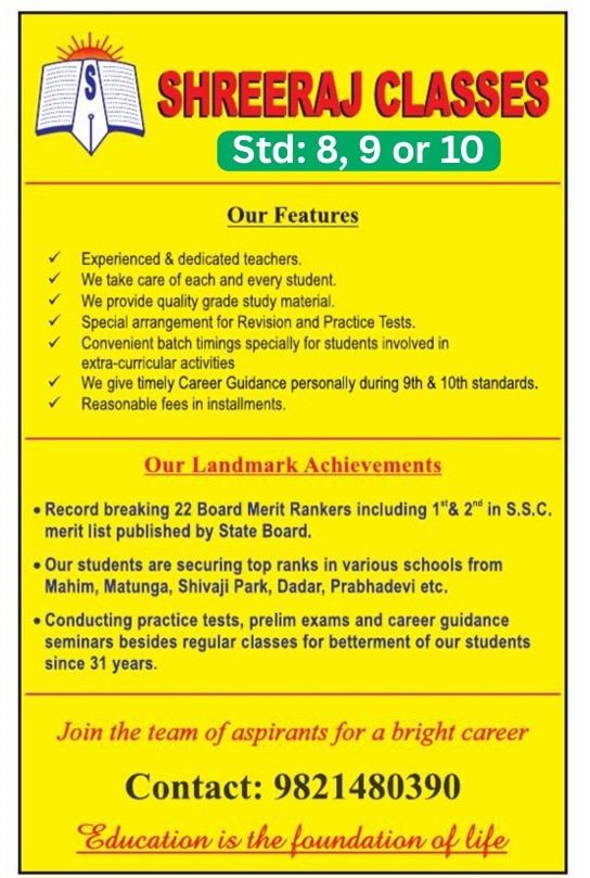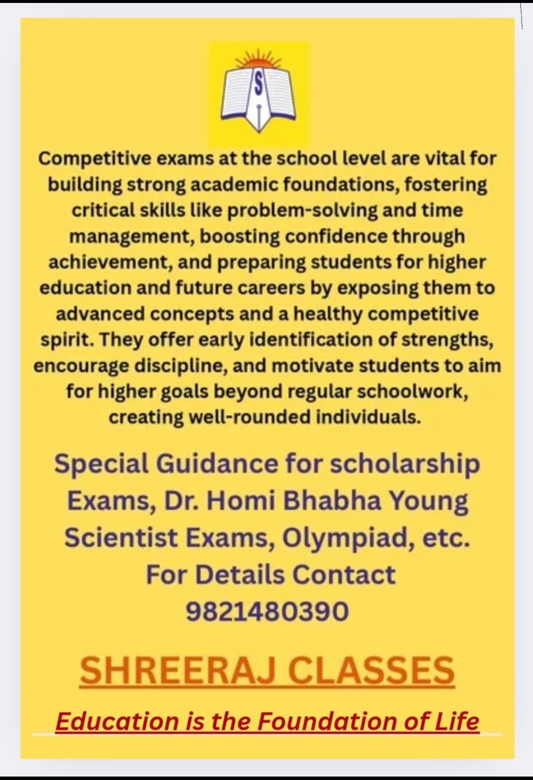 Shreeraj Classes in Shivaji Park ,Mahim offers dedicated Olympiad coaching designed to help students excel in competitive exams across all major subjects. The program covers Mathematics, Science, English, and Logical Reasoning, focusing on developing strong analytical and problem-solving skills. With a well-structured curriculum, students are trained beyond the school syllabus to tackle higher-level questions commonly seen in Olympiad exams. Mathematics coaching emphasizes advanced concepts, shortcut techniques, and critical thinking skills. Science sessions are designed to deepen understanding through concept-based learning and application-oriented questions in Physics, Chemistry, and Biology. English training focuses on vocabulary building, grammar, comprehension, and verbal reasoning, while Logical Reasoning enhances mental ability, pattern recognition, and analytical thinking. At Shreeraj Classes, experienced faculty members provide personalized attention through small batch sizes, ensuring each student’s strengths and weaknesses are addressed effectively. Regular mock tests, practice worksheets, and performance analysis help students track their progress and build exam confidence. Doubt-solving sessions and interactive teaching methods make learning engaging and effective. The Olympiad coaching at Shreeraj Classes in Mahim aims not only at achieving top ranks but also at strengthening core concepts and boosting overall academic performance, preparing students for future competitive challenges.